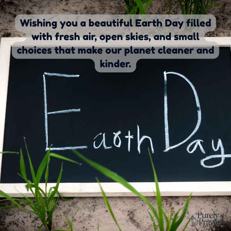 - Wishing you a beautiful Earth Day filled with fresh air, open skies, and small choices that make our planet cleaner and kinder.